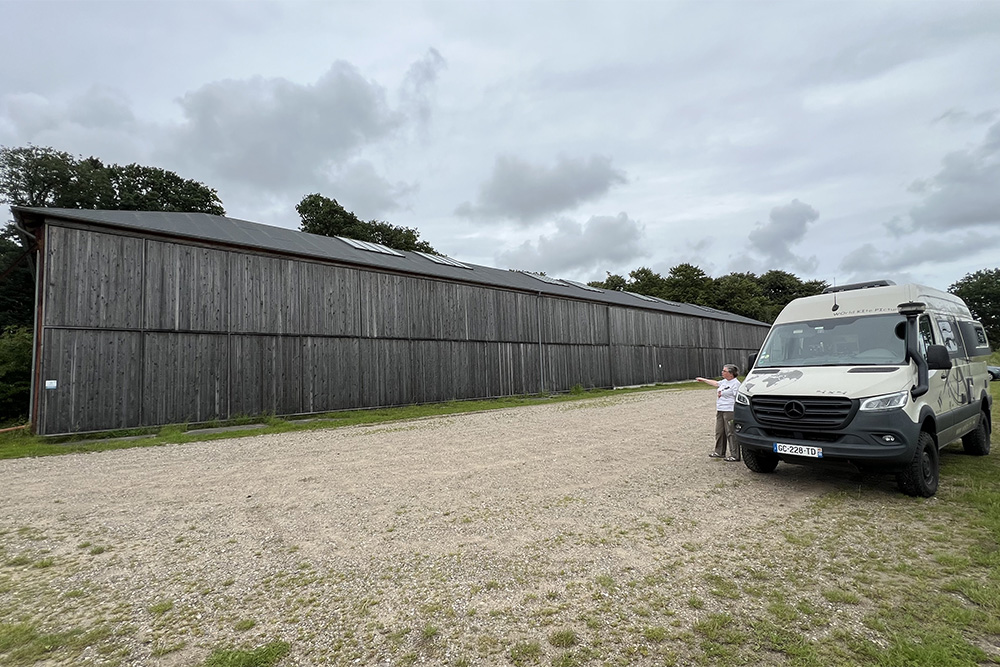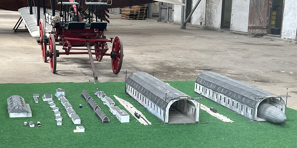 La curiosité nous a poussé jusqu’au site des Zeppelin à Tonder. En effet, la base de Tønder Zeppelin était l’un des principaux ports aériens allemands pendant la Première Guerre mondiale. Il y a un petit musée mais ouvert uniquement le WE. On récupère le plan des installations auprès de l’office du tourisme. On traverse un sous bois et on arrive à l’un des hangars. Le petit sur la photo de gauche, dans lequel il y a une maquette du site, deux avions. A l’extérieur plusieurs bâtiments et symboles.
